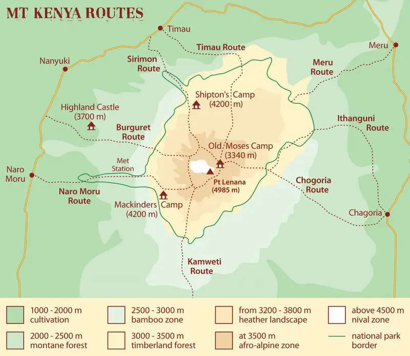 Here’s a detailed breakdown of the five main routes on Mount Kenya: